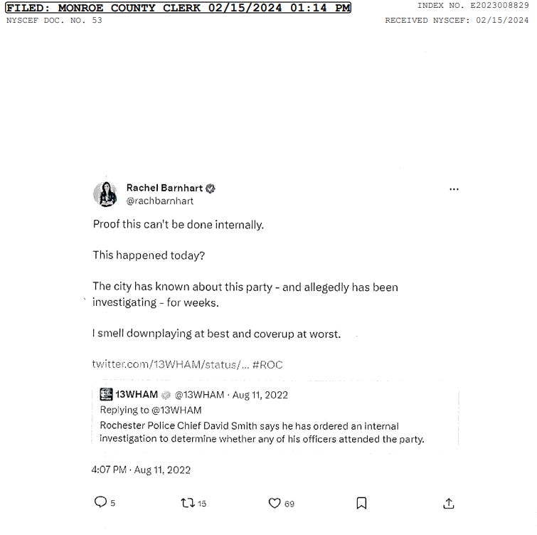McMurray is also the defendant in another lawsuit from Scott Peters, a longtime public servant and current Irondequoit Police Chief. Peters alleges that McMurray defamed him by claiming he was present at the Nicosia’s party. Though again, the Peters lawsuit occurred after the bulk of the actions under review in Nicosia v. Barnhart and McMurray.